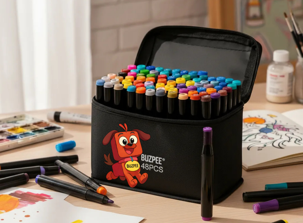 Para o público infantil menor, a linha Buzpee conta com canetinhas hidrocor com tinta à base de água.
